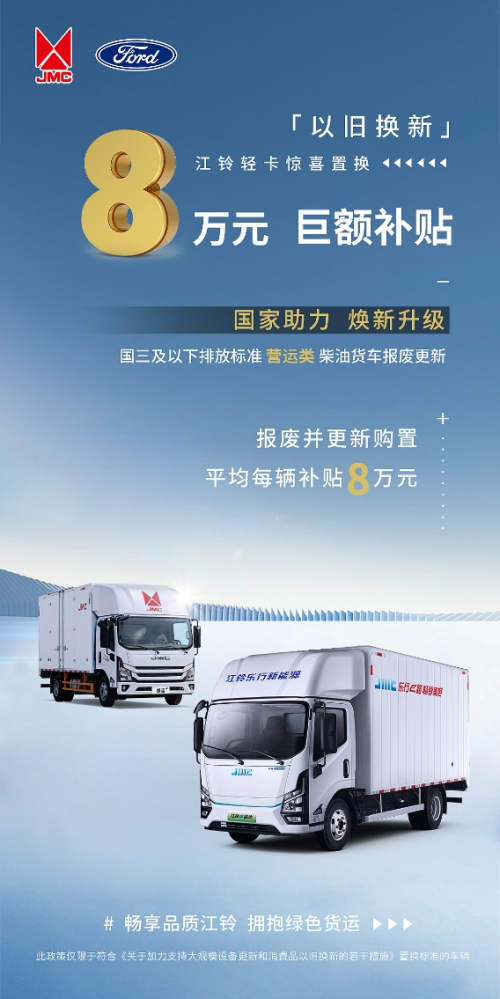 国家和江铃轻卡双重补贴政策的推行,加快了国三及以下排放标准营运类柴油货车的报废更新步伐。江铃轻卡已经在全国各地的经销商处设立了咨询服务窗口,为车主提供详细的政策解读和购车指导。我们在此呼吁广大车主抓住这次难得的机遇,积极参与老旧营运车辆的报废更新。