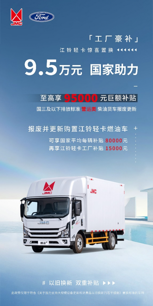 在环保与可持续发展成为时代主旋律的当下,货运领域的节能减排工作正在加速推进。国家政策的赋能背书,支持老旧营运货车报废更新,江铃轻卡积极响应,推出额外置换补贴方案。用户在更新购置江铃轻卡燃油车、新能源等特定车型时,有机会享受最高121000元巨额补贴。