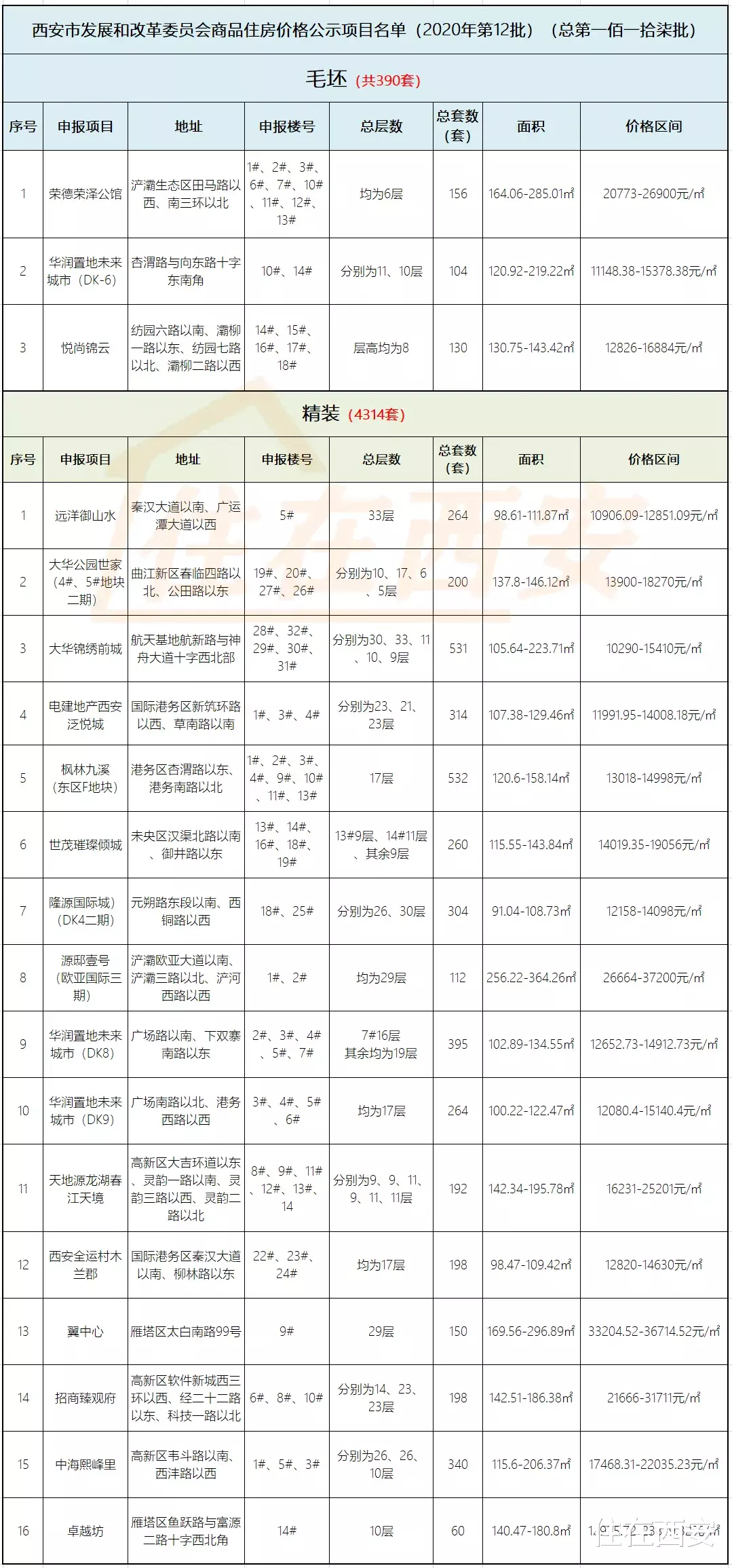 精装的项目为:远洋御山水、大华公园世家、大华锦绣前城、电建地产西安泛悦城、枫林九溪、世茂璀璨倾城、隆源国际城、源邸壹号、华润置地未来城市、天地源龙湖春江天境、西安全运村木兰郡、翼中心、招商臻观府、中海熙峰里、卓越坊。其中华润置地未来城市此次公示的既有毛坯房源,也有精装房源。