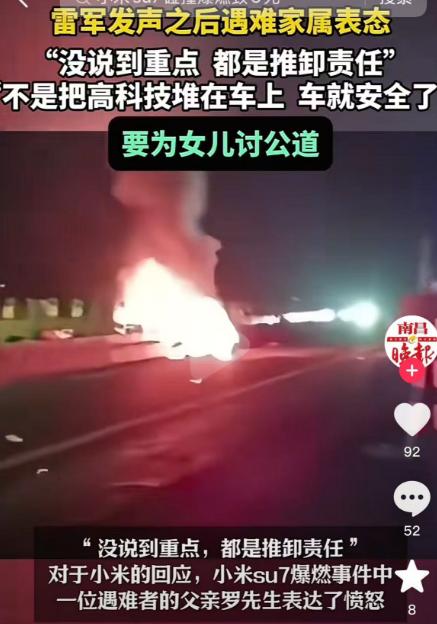 更是称雷军的回应没有说到重点,都是在推卸责任,并不是把高科技堆在车上,就安全了,一定要为女儿讨回公道。