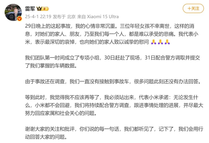 4月1日,晚间22:19分。针对小米SU7交通事故,小米集团创始人、董事长兼CEO雷军在微博回应称,无论发生什么,小米都不会回避,将持续配合警方调查,跟进事情处理的进展,并尽最大努力回应家属和社会关心的问题。