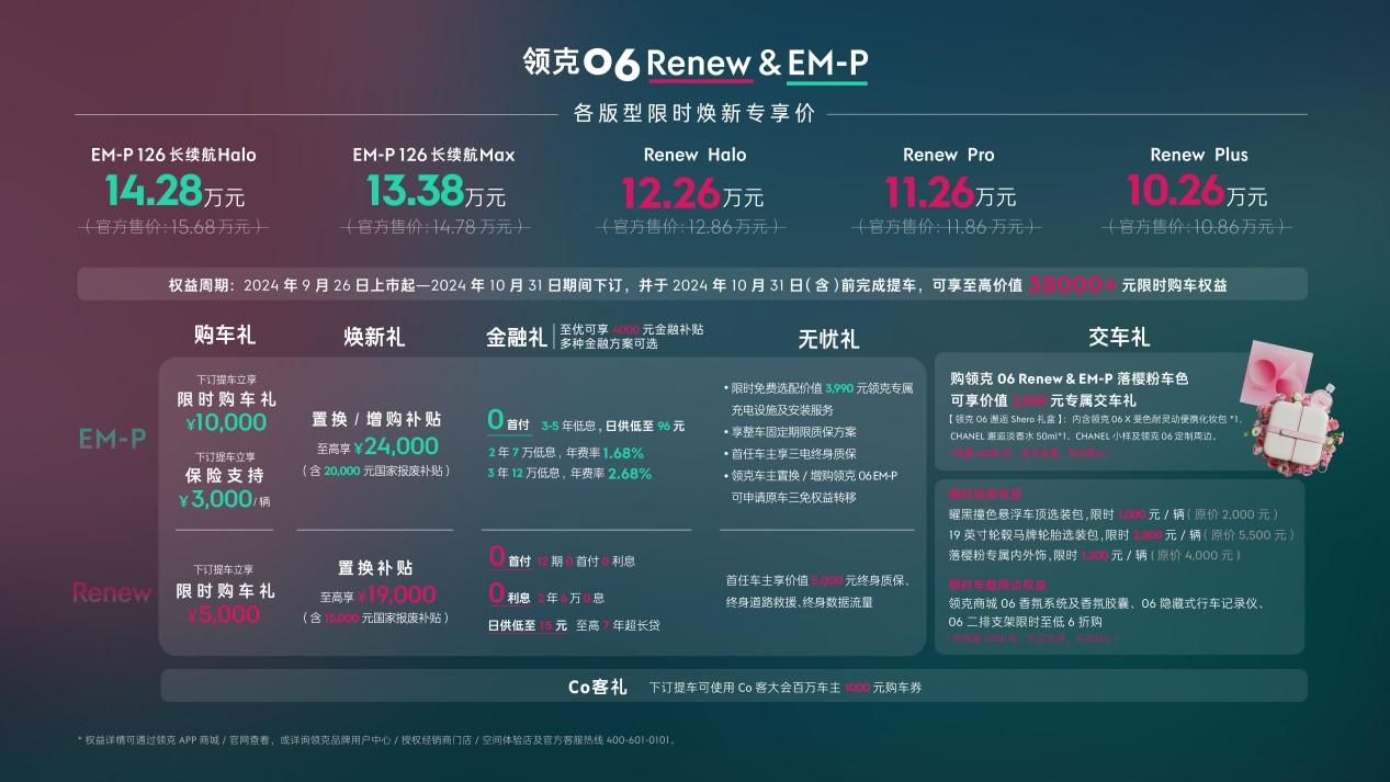 【9月26日,杭州】领克06 Renew及领克06 EM-P正式上市,机智进化实力进阶,限时焕新专享价为10.26万元-14.28万元。其中领克06 Renew定位“机智灵动SUV”,领克06 EM-P定位“机智超电SUV“。双车焕新上市,可油可电,随心智选。以多元的出行场景,带来不止于车的生活方式,打造“属于年轻人的第一台机智SUV”。