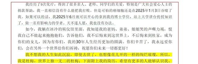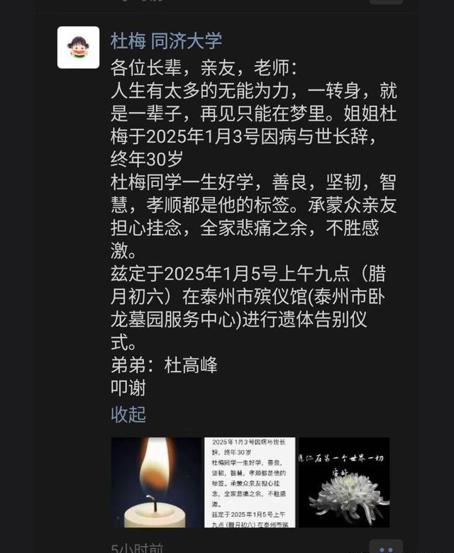 1月5日,同济大学的女博士杜梅因病离世,年仅30岁。