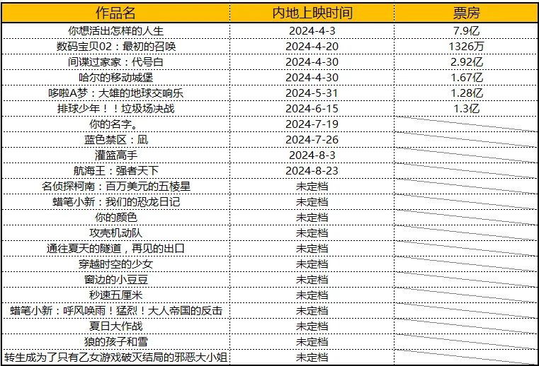 由于近几年整体票房走势亮眼,如《排球少年!!》这类日影(注:该词在本文主要指代日本动画电影)逐渐成了中国电影市场的一个大品类,一定程度上成了填补好莱坞超级IP电影的优选。不少国内电影公司在日影上加码,大量旧作引进、经典作品内地重映,宣发模式各出奇招,宣发成本上了一个量级。根据各种引进、定档新闻进行统计,2024年全年约有22部日影已经或将要在内地上映。