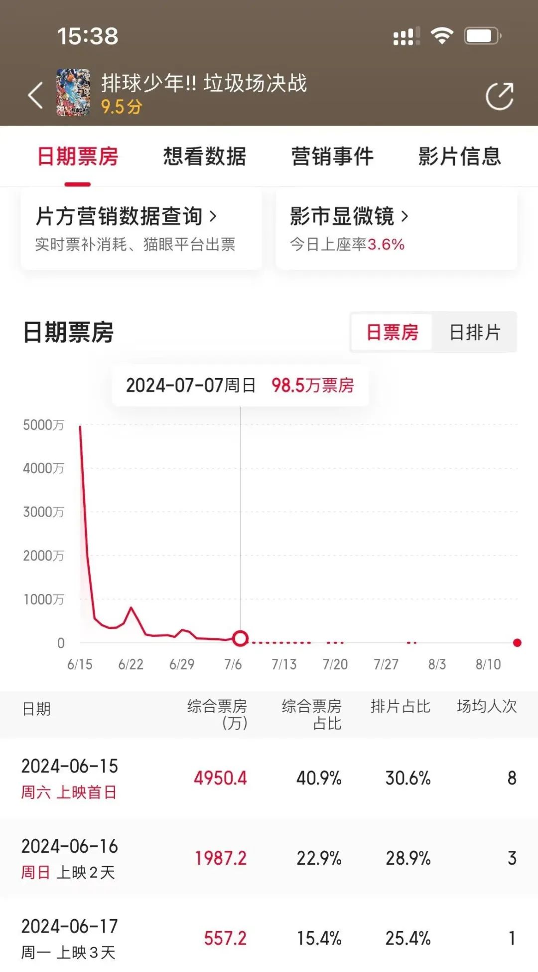 另外,日本动画电影在中国电影始终是一种不够大众化的电影类型,影院的排片不会因为其有特典就为其倾斜,高排片场次永远留给热门作品,这也使得特典的发放主要集中在前两周,很难像日本那样实现长尾效应。比如《排球少年!!》剧场版首周末排片还有28%,第二周周末排片为9%,第三周就只剩3%了。