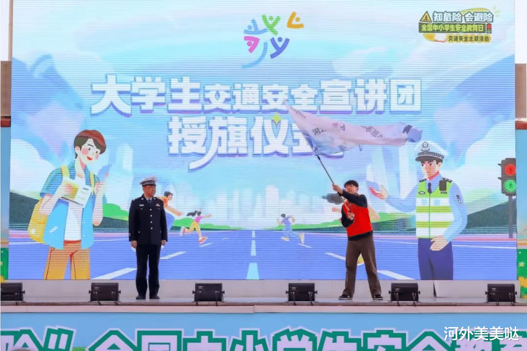 在活动过程中,石家庄市交通管理局副局长张敬军将“河北省大学生交通安全宣讲团”队旗郑重授予河北外国语学院“蒲公英计划”大学生交通安全宣讲团,这标志着河北省首支大学生交通安全宣讲团正式在河北外国语学院传媒学院成立。