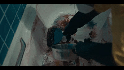 一个身穿防护服,头戴防毒面罩的人出现了。只见他盛出浴缸里的血水,搬开被尸水蔓延的各种家具,铲起黏在地上的尸液,如果尸液渗透进了地板,还需要把地板撬开,墙上被溅到血液的瓷砖,也被电钻震碎。