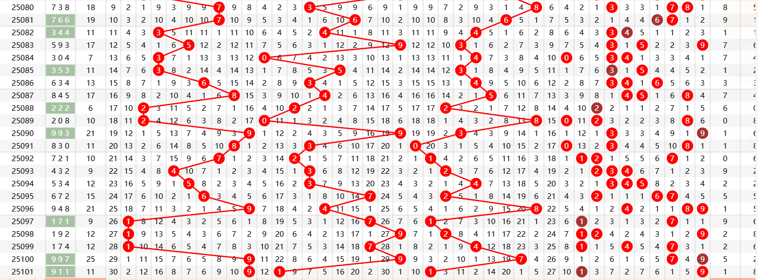 911和值 = 9+1+1 =11(中和值)。和值大幅下降14点,符合“大和值后回调”的历史常见趋势。
