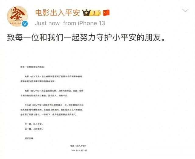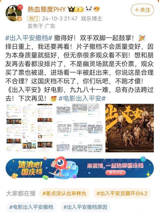 原定于9月30日上映的《出入平安》,在仅仅上映数日后,于10月3日晚突然宣布撤档。