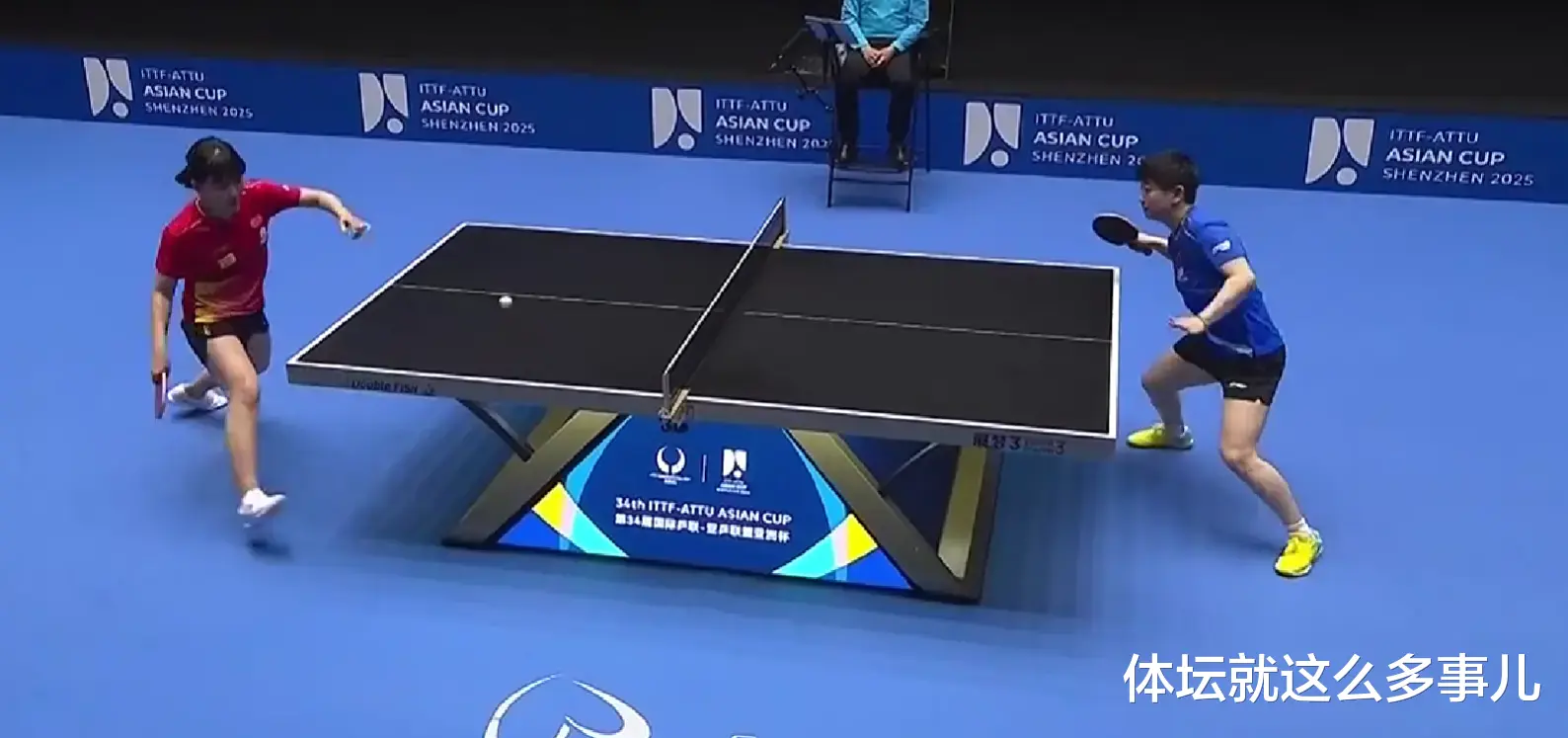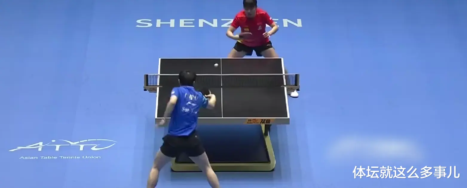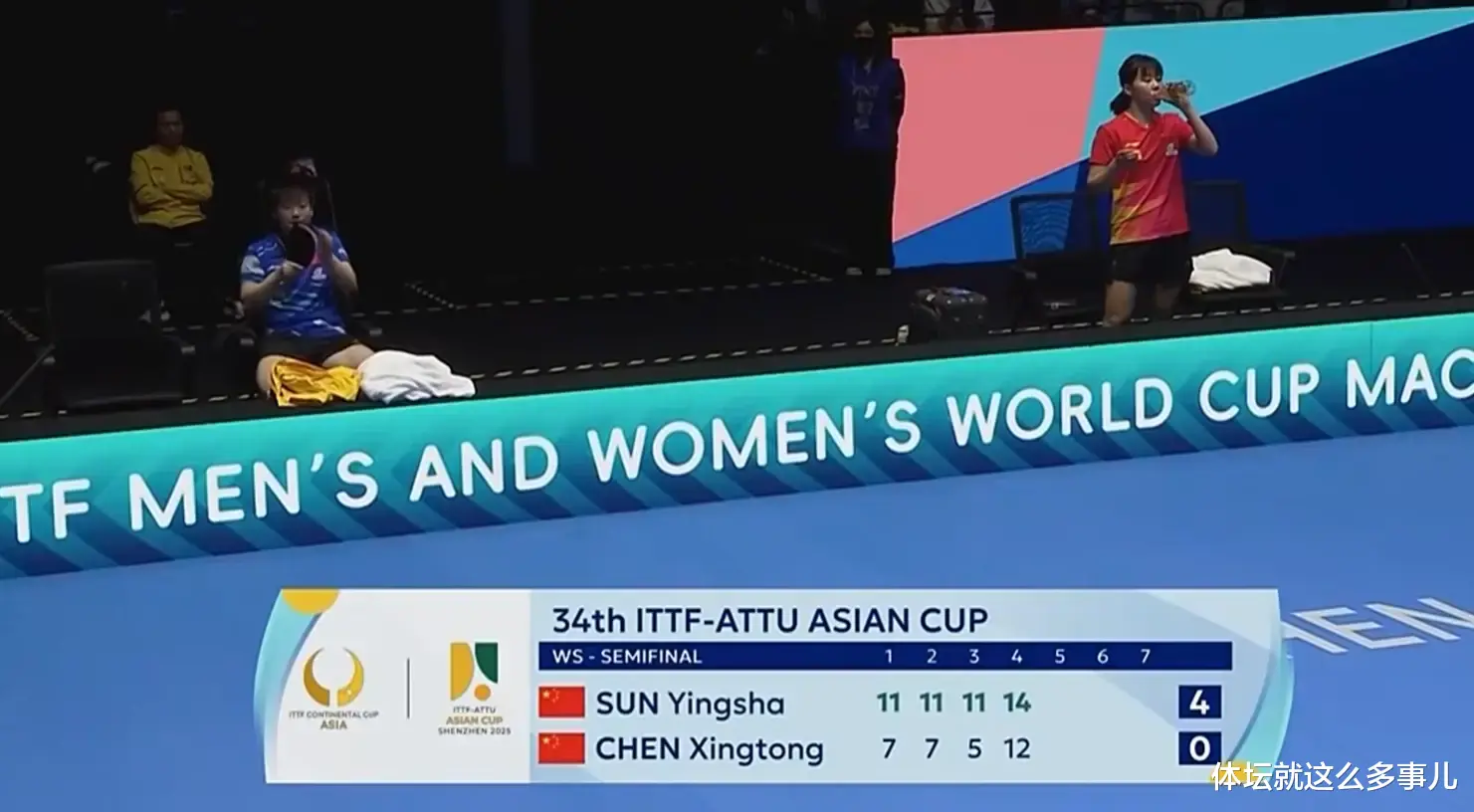 在暂停休息期间,孙颖莎坐在场边稍稍休息后,拿起水瓶喝水,补充体力,随后比赛继续,孙颖莎发球,但是不慎直接发球失误,陈幸同追分至5-7,此后,孙颖莎发力得分,以8-5扩大分差。