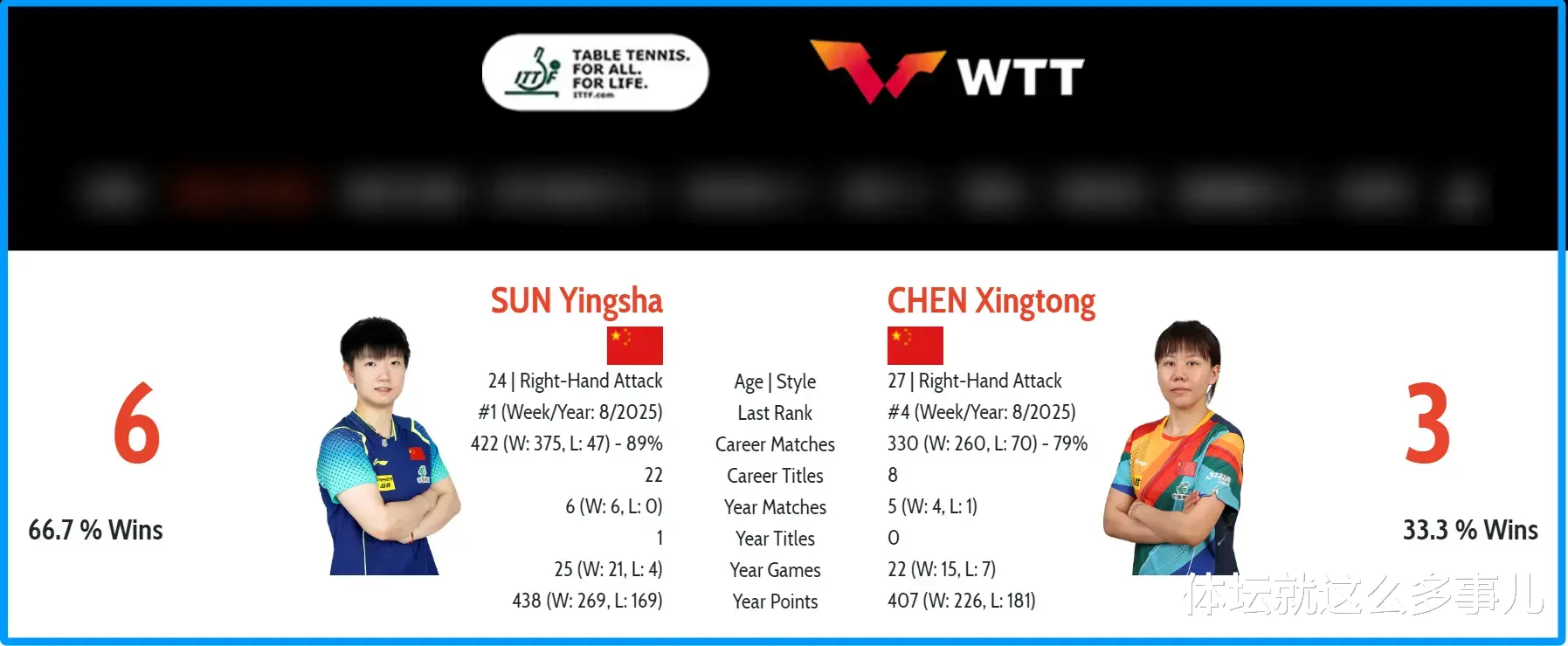 孙颖莎赛前女单排名世界第一,陈幸同排名世界第四位,另外,国际乒联官方数据显示,孙颖莎和陈幸同曾交手过9次,孙颖莎6胜3负占上风。本场比赛,央视CCTV5+频道直播。