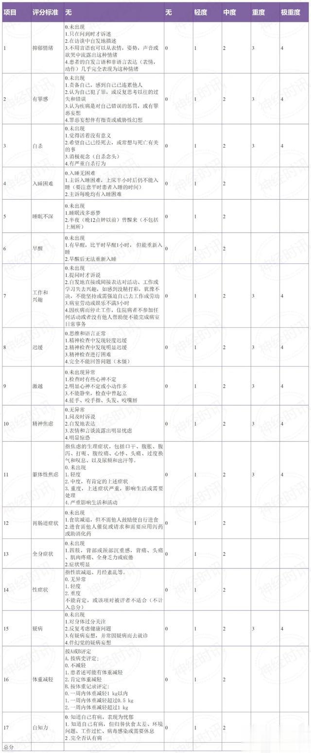 说明:HAMD-17评分:7~17分可能有抑郁症,18~24分肯定有抑郁症,>24分严重抑郁症。