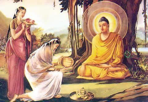 有一天,他在尼连河附近,因劳累饥饿过度,昏倒在地。一位牧女看见了,便用身边的杂粮加些野果,用清泉水煮熬成乳糜状的粥,一口一口地喂他。