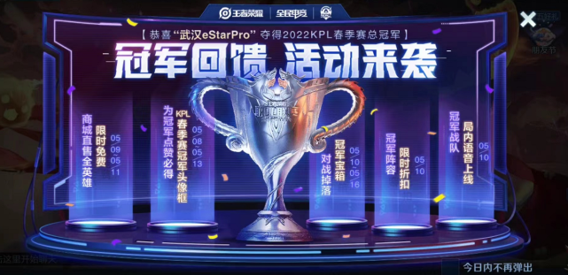 2022年KPL春季赛总决赛圆满结束,武汉eStarPro获得总决赛冠军,通过相关信物可以兑换冠军礼包/宝箱,打开礼包/宝箱可以获得英雄、回城特效等奖励。同时,活动期间参与对战即可掉落冠军纪念宝箱,开启宝箱可以获得英雄/皮肤/1日体验卡等奖励。