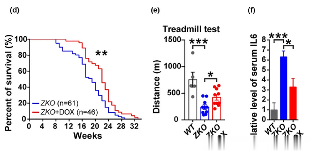 该研究显示,多西环素可以减缓早衰小鼠模型的衰老,延长寿命,并改善衰老特征,包括减轻成纤维细胞的衰老和死亡,下调血清和组织中促炎性IL6的水平,以及阻止α-微管蛋白乙酰化。