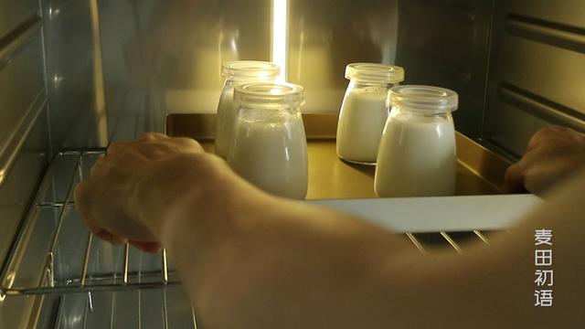 送入发酵箱、烤箱或者酸奶机发酵,设置发酵温度为42度,一般发酵6-8小时,温度越高发酵越快,但不要超过50度以免乳酸菌失活。你也可以放在30度以上的室温环境或温暖的地方,时间需要8-12小时。具体发酵时间根据环境灵活调整,判断发酵完成的方法是倾斜瓶子酸奶不会流动,或者用汤匙舀起酸奶呈块状。