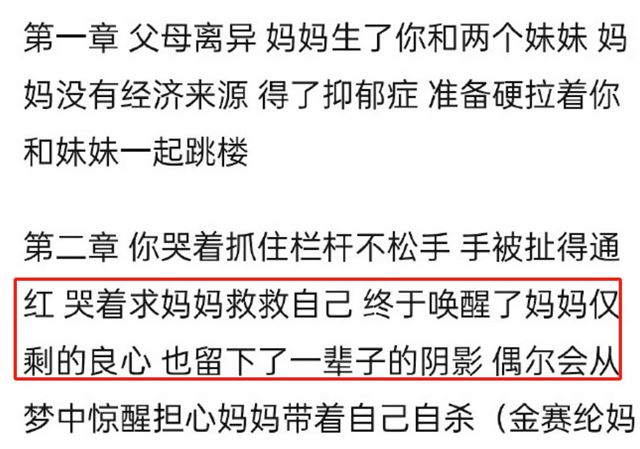 然而,命运对母亲并不宽厚,母亲严重抑郁,甚至曾试图带着金赛纶和两个妹妹跳楼自尽。