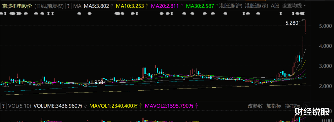 由于港股缺乏流动性,京城机电股份涨幅不如A股,但从11月19日起,也翻了大约一倍,尤其是12月8日出现了单日超过35%的巨大上涨。