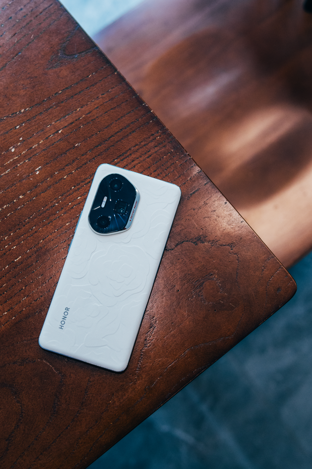 荣耀300 Ultra的主打色是“山茶白”,灵感源于云南昆明市花山茶花(编者按:其实,重庆的市花也是山茶花),名如其花呈现出的纯洁雅致又不失尊贵的独特气质,加上花瓣纹理,清雅浪漫让人过目难忘。