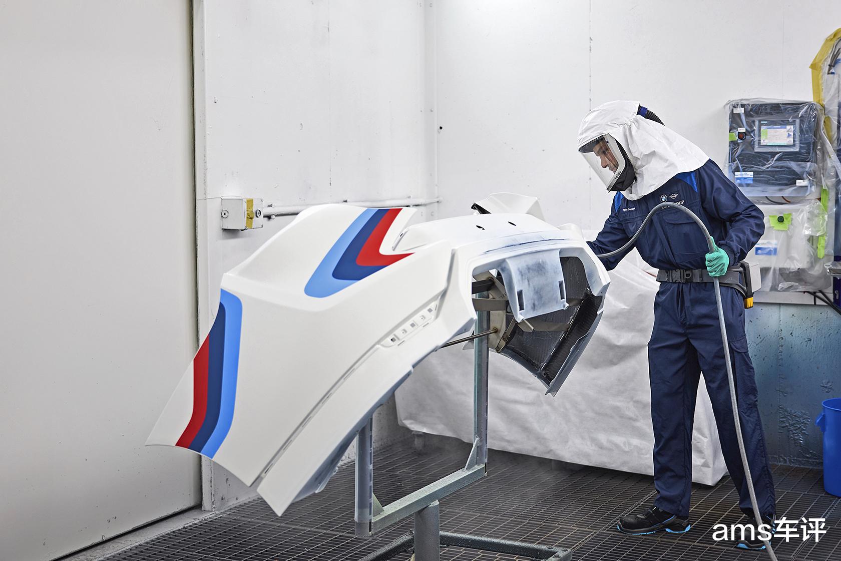 3.0 CSL使用的M4主车身是在丁戈尔芬常规生产线上完成焊接的。接下来车身来到一个特殊区域进行加宽处理,这是为了能够实现来自老款3.0 CSL的轮拱设计灵感。再之后它将会进行涂漆处理。而这就是手工作业真正开始的地方,因为贯穿整辆车的经典宝马三色M条纹是通过喷漆绘制而非电化铝烫印到车身上去的。