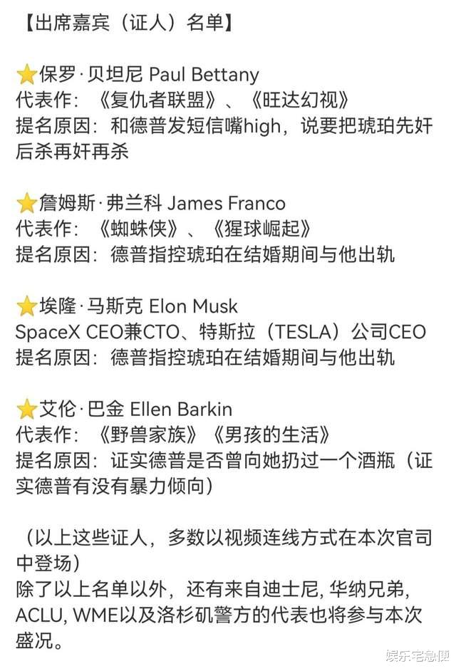 艾梅柏这边提供的证人,最著名的是埃隆马斯克(世界首富)和弗兰科(猩球崛起主演);德普这边提供的证人有保罗贝坦尼(旺达幻视主演),还有艾伦巴金(野兽男孩主演)!