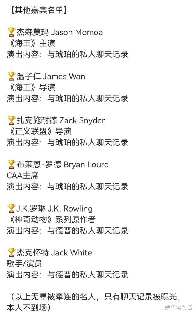 这几位是将以视频连线的方式出现在现场。其余涉及到的名人,还包括杰森莫玛,jk罗琳等等,他们本人不到场,阿里通他们与当事人聊天记录将曝光。
