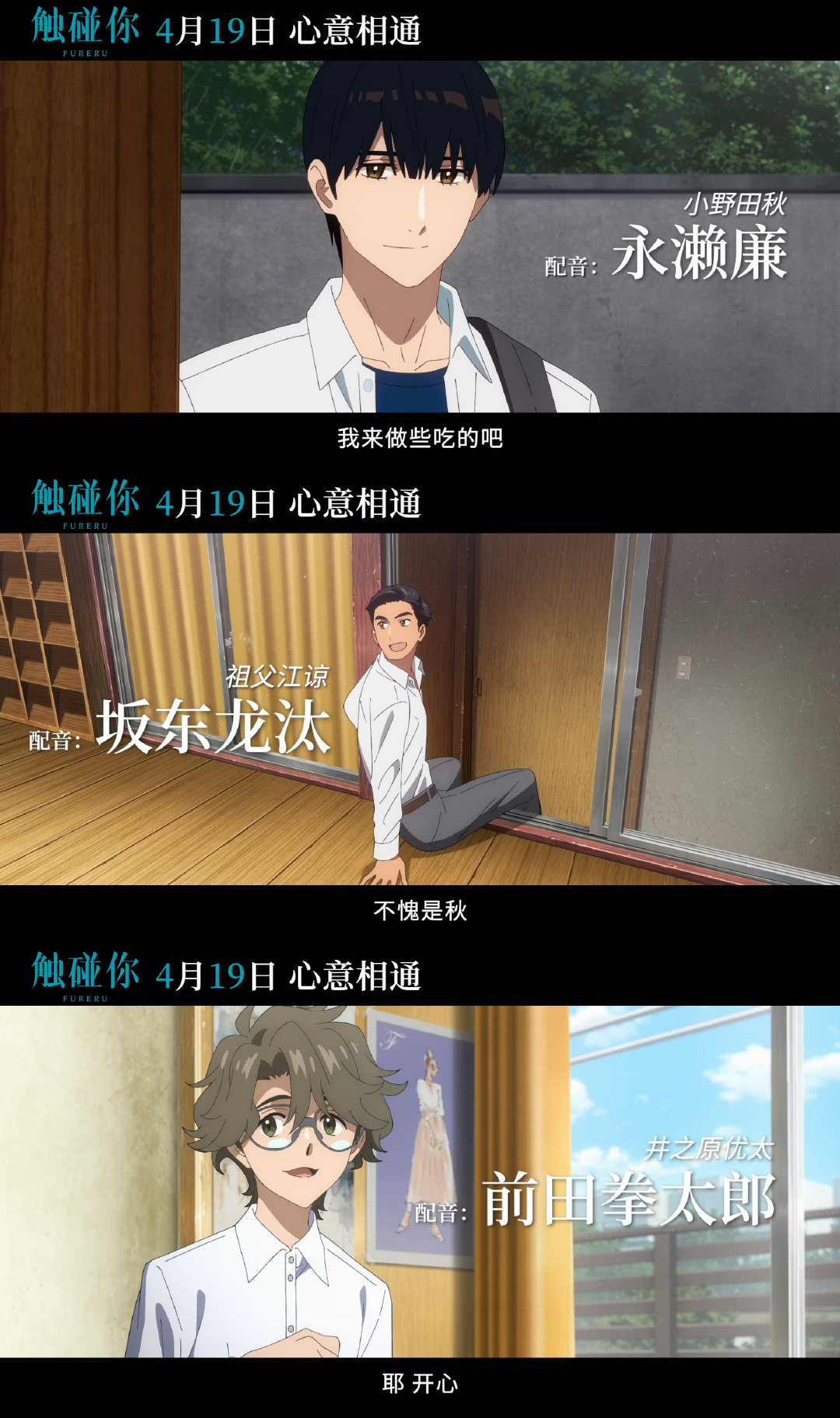 影片的配音阵容同样值得期待。日本人气偶像男团“King Prince”成员永濑廉、新生代演技派演员坂东龙汰、“剧团EXILE”成员前田拳太郎分别为三位主人公献声。他们的精彩演绎,为影片增添了不少色彩。主题曲《单调/Monotone》由日本超一线音乐组合YOASOBI倾情献唱,知名作曲家横山克和潮流音乐人TeddyLoid联手打造的原声音乐,也为影片营造了温馨治愈的氛围。从“触不可及”到“触碰你”,主创团队试图通过这部作品传达出更为深刻的情感体验。《未闻花名》中一句“面码,找到你了”曾赚足无数人的眼泪,而《触碰你》则希望延续那份感动,并通过新的故事带来更多心灵的触动。