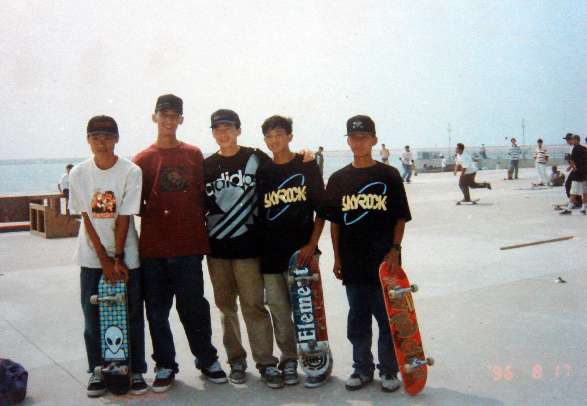 20世纪末滑板传入中国,此时的田军正年少(左三)。