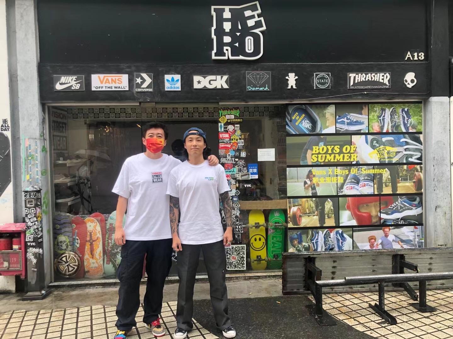 出发去东京前,田军带上了印有国旗的口罩,和滑板店店长合影。南都、N视频记者王凯 摄
