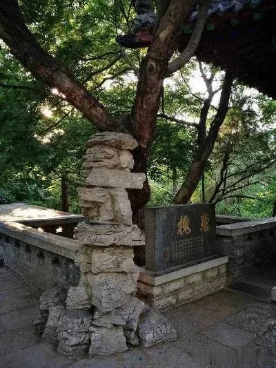 旁边这棵唐槐又称秦琼拴马槐。传说秦琼很孝顺,每年都来干佛山为他的老母亲进香,为了表达对母亲的一片孝心,从不骑马上山,而将马拴在这棵树上。这棵古槐树树干已经空了,但有一棵幼槐穿过树洞勃然而生,就像母亲抱着孩子一样,所以这棵树又称“母子愧”,显示了强大的生命力,大有枯木逢春之意。