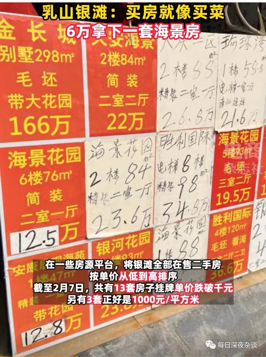 这两天威海乳山银滩部分海景房房价跌破1000元的消息引发关注。最便宜的一套,单价仅795元/平方米,6.2万元就能拿下约78平方米的两室两厅。在一些房源平台,将银滩全部在售二手房按单价从低到高排序,可以发现,截至2月7日,银滩一共有13套房子挂牌单价跌破千元,另有3套正好是1000元/平方米。