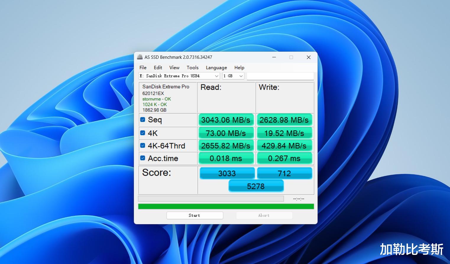 在AS SSD Benchmark中,闪迪至尊超极速移动固态硬盘USB4版分别为3043MB/s与2628MB/s。注意,AS SSD都是测试的100%完全不可压缩缩数据模型,这样数据模型比较极端,但是闪迪至尊超极速移动固态硬盘USB4版依然拿到了5278的高分。