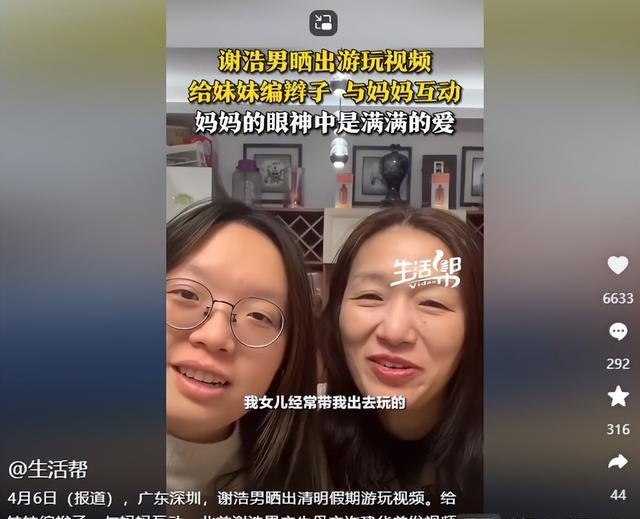 [2]官方账号生活帮2025年4月6日《4月6日(报道),广东深圳,谢浩男晒出清明假期游玩视频。给妹妹编辫子,与妈妈互动。》
