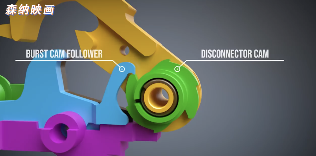那么M16是如何实现最经典的三发点射功能?设计人员在击锤下部增加了一个棘轮(二声),同时在单发阻铁前端也增加了一个止动钩,通过棘轮中的弹簧离合器来实现棘轮与击锤的单向随动。在扣下扳机后击锤被释放,同时弹簧被收紧,击锤与棘轮实现联动,击锤倒下后棘轮被止动钩勾住,同时较浅的棘轮使得单发阻铁也不会勾住击锤,等到第三发的时候,棘轮上对应的位置会有一个较深的齿,这个齿会让止动钩咬合的更深一点,这样后方的单发阻铁就能勾住击锤,一轮三连发就完成了。