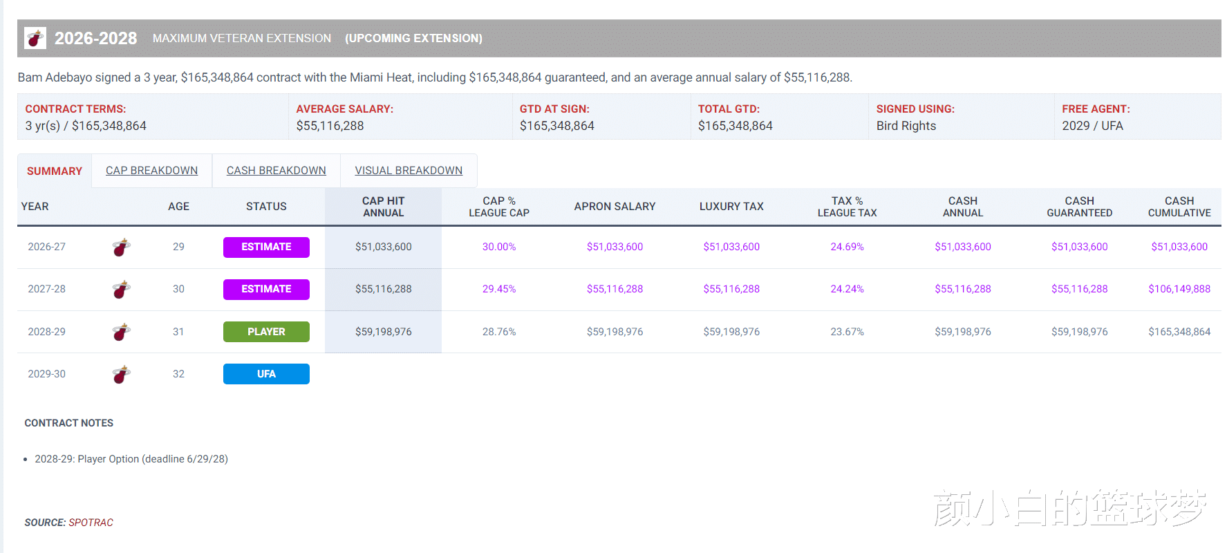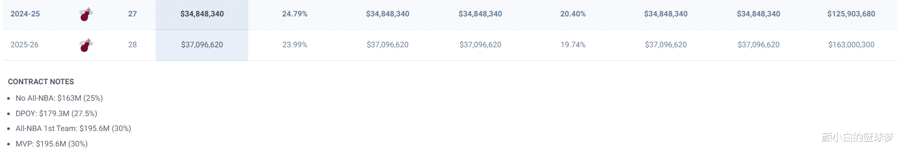 阿德巴约在去年夏天与热火达成一份三年1.65亿的提前续约合同,未来的五年他的合同还剩五年2.3亿,他这样的状态明显溢价。