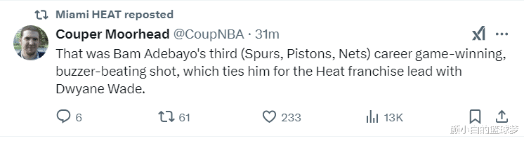 热火记者Couper Moorhead写道:这是阿德巴约生涯第三次完成读秒绝杀(马刺、活塞、篮网),这也让他追平德维恩-韦德并列球队史上读秒绝杀最多的球员。