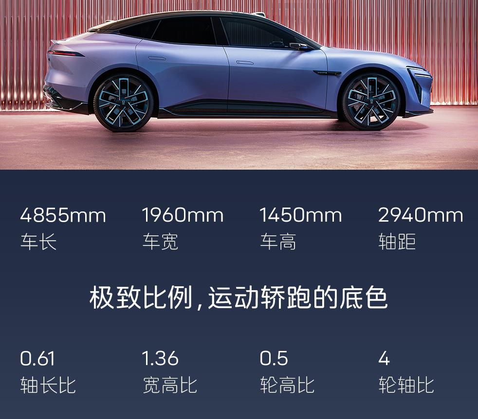 阿维塔06在外观设计方面以"猎豹凝势"为设计理念,整体极具运动与未来感。新车拥有着1.36的宽高比与0.61的轴长比,配合2940mm超长轴距和4855mm车身,呈现出低趴宽体的猎态身姿。同时阿维塔06整车的风阻系数仅为0.23Cd。
