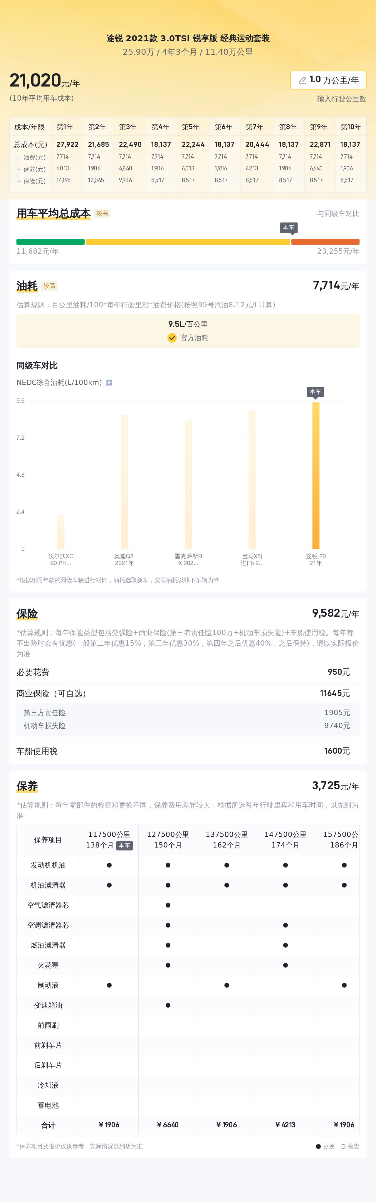 在用车成本方面,根据估算,这辆途锐的年均综合用车成本约为2.1万元。对于一款豪华SUV而言,这一成本属于正常范围。