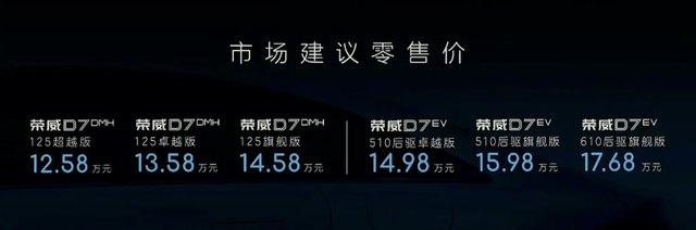 荣威D7有两种动力规格,分别是DMH混动以及EV纯电,前者有三款车型,为12.58万起到14.58万,中间还有一款13.58万的125卓越版。纯电版本也分为三款车型,两种为510公里版本另外一种是610公里版本,价格为14.98万到17.68万,单看这个价格确实称不上便宜。
