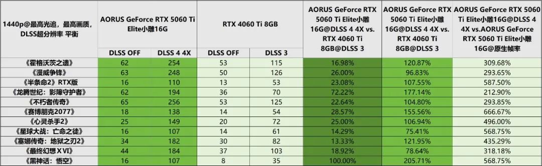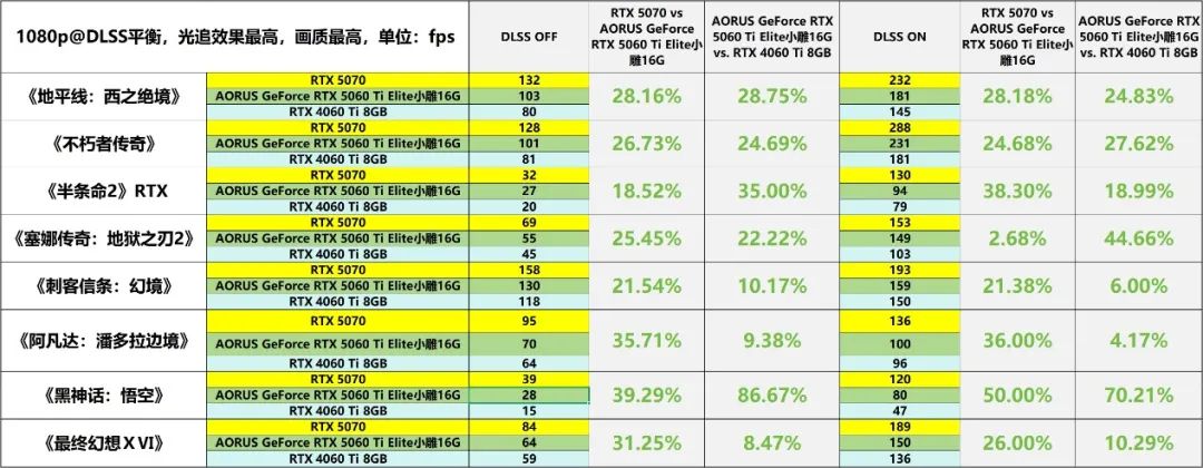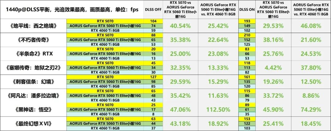 接下来聚焦传统光追游戏性能测试环节。在统一采用最高游戏特效与最高光追效果的测试标准下(后续所有对比测试均基于此设定),AORUS GeForce RTX 5060 Ti Elite小雕16G展现出符合预期的性能表现。当我们将画面分辨率调整到1440p后,AORUS GeForce RTX 5060 Ti Elite小雕16G的表现依旧符合其水准。在与RTX 4060 Ti的对比中,无论是在开启还是关闭DLSS技术的条件下,AORUS GeForce RTX 5060 Ti Elite小雕16G均能够稳定地实现接近30%的平均帧率领先。尽管AORUS GeForce RTX 5060 Ti Elite小雕16G在帧率表现上依然可圈可点,但与RTX 5070之间仍存在约30%的性能落差。值得注意的是,这一差距较此前3DMark理论性能测试中观察到的差异有所收窄。