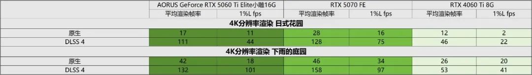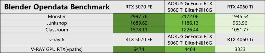 在这部分测试中,我们通过Blender Opendata Benchmark和V-RAY GPU RTX测试了AORUS GeForce RTX 5060 Ti Elite小雕16G的实际性能表现。在前者的Monster、Junkshop、Classroom三项测试中,AORUS GeForce RTX 5060 Ti Elite小雕16G分别得到了2172、1186、1226分,而RTX 4060 Ti分别得到了1946、964、1052分,有一定提升。在V-RAY GPU RTX测试中,AORUS GeForce RTX 5060 Ti Elite小雕16G得到了4404分,RTX 4060 Ti得到了3333分,前者领先后者32%。除此之外,由于AORUS GeForce RTX 5060 Ti Elite小雕16G支持DLSS 4,因此它在D5渲染器中较RTX 4060 Ti优势明显,以4K分辨率渲染的日式花园为例,开启DLSS 4之后的AORUS GeForce RTX 5060 Ti Elite小雕16G得到了128的平均渲染帧率,而开启DLSS 3的RTX 4060 Ti的平均渲染帧率仅有46。