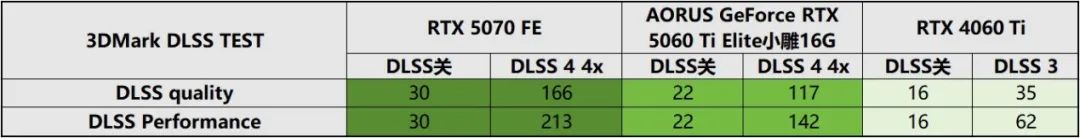 在RTX 50系列GPU中,DLSS 4通过其独特的多帧生成技术,行之有效地于DLSS 3基础之上大幅提升了帧率水平。这一技术突破并非夸大其词,而是通过客观测试数据得以验证——在GPU基准性能评估环节,我们采用3DMark DLSS TEST对参与测试的显卡进行了初步测试。测试数据显示,AORUS GeForce RTX 5060 Ti Elite小雕16G在启用DLSS 4后,帧率表现呈现出显著跃升——具体而言,其原生帧率约22fps的基础水平,在DLSS 4质量模式下提升至117fps,性能模式下更达到142fps,实现了多倍于原生帧率的性能释放。这一提升幅度,直观反映了DLSS 4对硬件算力的有效扩展。相较之下,仅支持DLSS 3的RTX 4060 Ti在相同测试场景下,质量模式与性能模式的帧率分别为35fps和62fps,与AORUS GeForce RTX 5060 Ti Elite小雕16G差距明显。