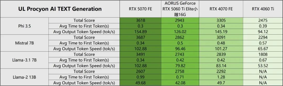 在AI文本生成方面,AORUS GeForce RTX 5060 Ti Elite小雕16G比RTX 4060 Ti的生产效率更高,能够节省更多耗时。而在AI图像生成方面,由于AORUS GeForce RTX 5060 Ti Elite小雕16G支持FP4,且FP4对显存容量的要求更低,因此它能够完成UL Procyon AI图像生成测试,并且拥有不错的出片速度,而RTX 4060 Ti并不支持该项测试。而在其余AI图像生成测试中,对比RTX 4060 Ti,AORUS GeForce RTX 5060 Ti Elite小雕16G均有更明显的优势。
