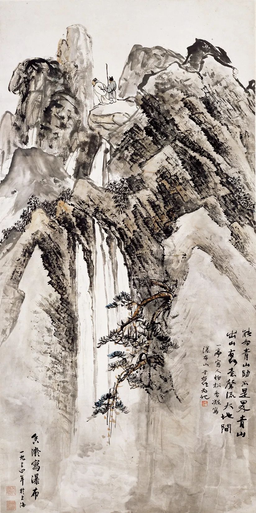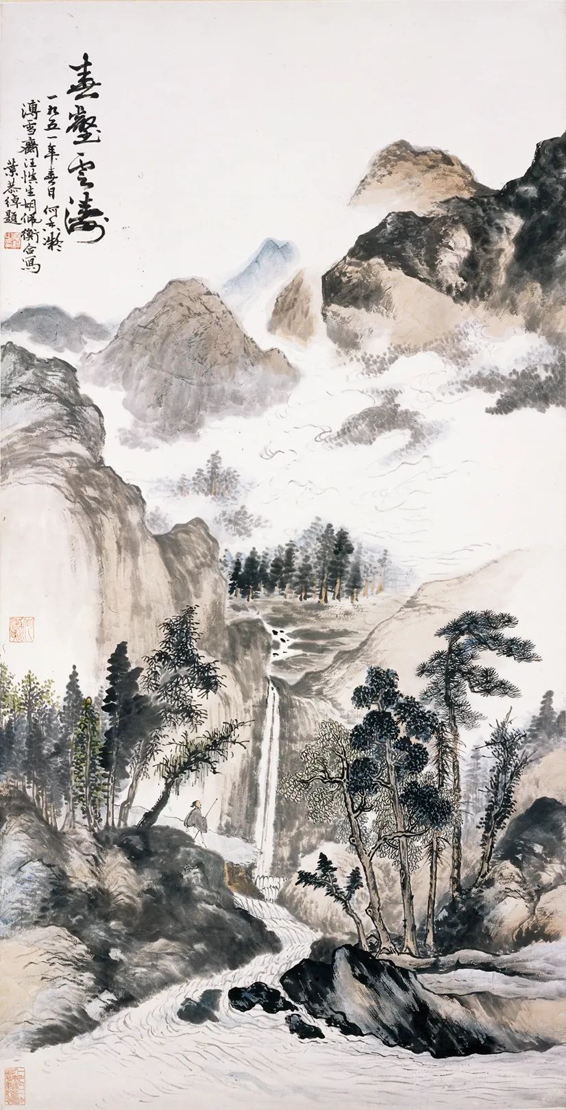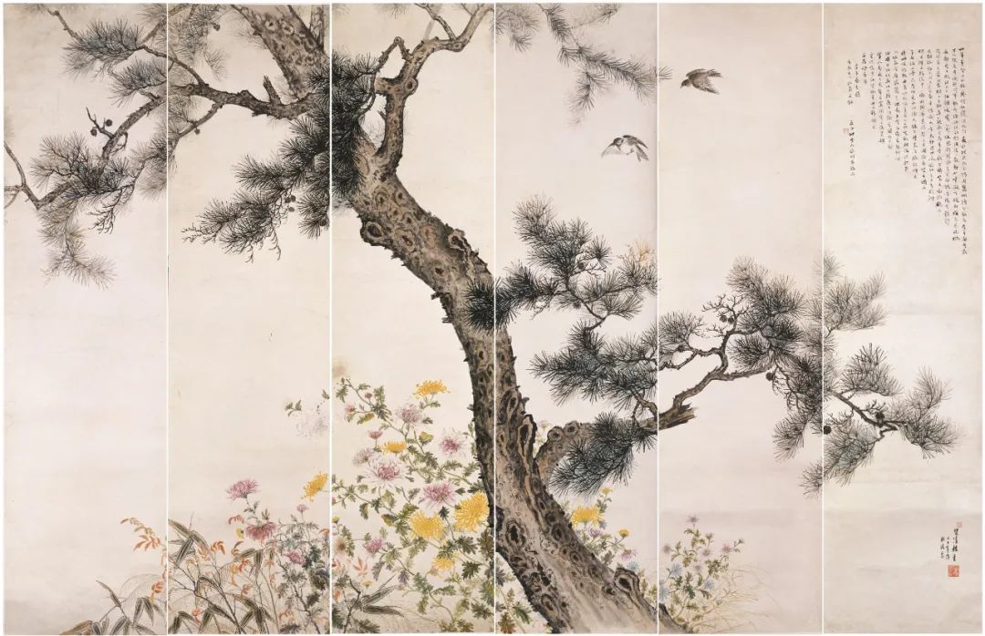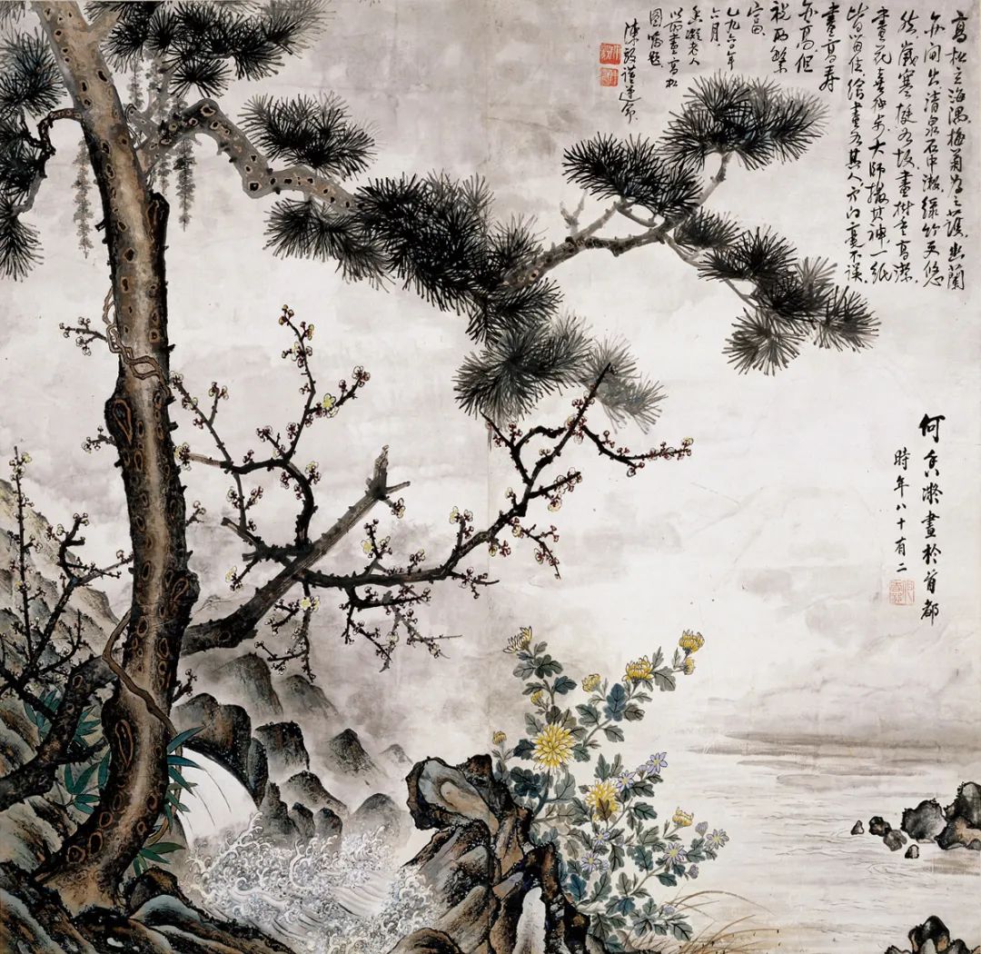 20世纪初,何香凝与丈夫廖仲恺东渡日本求学,寻求新知,她于1908年入读女子美术学校的高等科学绘画,同时向端馆紫川、田中赖章学习,《狮》《虎》恰是早期难得的精品。她这个时期的画,都离不开她师傅的格调和画风……其特点是保持着浓厚的日本画风格,喜爱明艳色彩,形象生动。” (廖承志) 1911年辛亥革命,先生随之归国,与民族、国家共命运,先生的绘画创作活动也始终联结着其革命理想人格精神。绘画的风格自20世纪20年代开始,逐步转向古典水墨的审美;创作的题材除延续狮、虎猛兽动物形象之外,古典山水及君子”题材成为创作主体,如《松•竹•梅》 (1928年) 、《山水》 (1929年) 、《松·菊》 (1931年) 、《青山瀑布》 (1934年) 、《绿梅》 (1943年) 、《冰雪暖于棉》 (1951年) 等是其不同时期的代表。陈毅题跋的《高松立海隅》 (1960) 则是八十二岁时所作。诚如郭沫若1954年的跋文:革命乃高度之艺术,先生之革命事业之艺术活动,会而为一,非偶然也。”26件精品既体现出先生松柏般的人格精神,也是近代百年历史的见证。