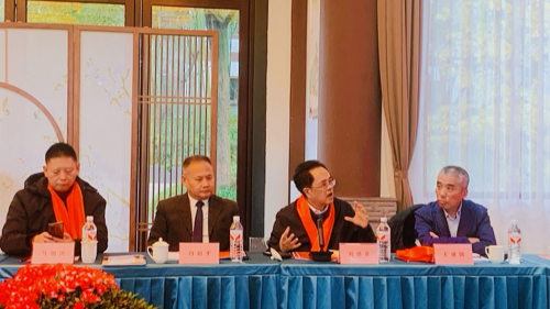 图为党校教授、博士生导师、中国超越之路战略中心主任,北京大学中国战略研究中心创始副主任刘德喜(右2)发言。图中有中国文促会副会长兼秘书长王建国(右1),中国文促会止戈文化工作委员会主任白朝平(右3),四川省林草局生态旅游中心原主任、洪雅县原副县长马朝洪(右4)