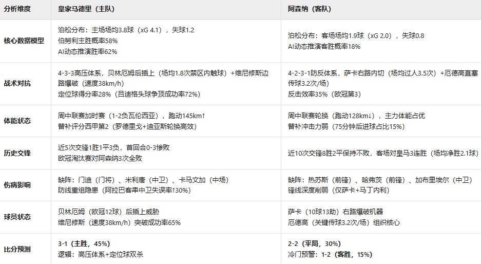 战术杀招:安切洛蒂或变阵4-2-3-1,贝林厄姆回撤调度+维尼修斯左路爆破,专打阿森纳替补中卫基维奥尔转身慢弱点。