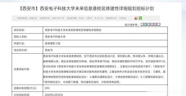 就在今天,辛宇同学看到了西安电子科技大学新校区规划,占地1298亩。