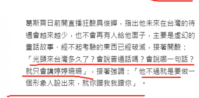 另外葛斯齐还表示:他在台湾的待遇会越来越少,也不会再有人给他面子,虚幻的童话故事、经不起考验的东西已经破灭。