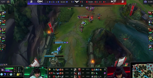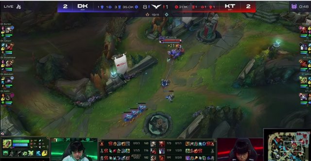 DK最近的比赛可以说只能险象环生来形容。在前期的15分钟。Snowmaker的飞机在先锋团当中一马当先,打出了四杀。这可以说让所有的人都为T1捏了把汗。但是后来事实证明,前期的优势根本不足以维持到后期。虽然说一直到中期为止,DK都掌握着最大幅度的优势。但是一旦到了后期,他们的阵容就显得有些乏力了。