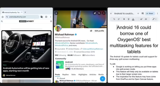 同时有消息源透露,谷歌计划在安卓 16系统中升级分屏模式,支持同时运行3款应用程序。